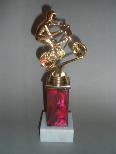 Sehr schöner Radfahrpokal (BMX) auf einem rot marmorierten Kunststoffsockel der auf einem weißen Marmorsockel montiert ist. Auf dem Marmorsockel bringen wir gerne ein Gravurschild mit dem von Ihnen gewünschten Text an (Bitte teilen Sie uns den Gravurtext nach dem Kauf per eMail mit). Gesamthöhe des Pokals: ca. 24cm.